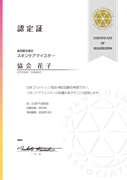 | 試験概要 | スキンケアのほか、化粧品、サプリメント、エステティック、美容医療、関連法規に至る美容の総合的な知識の習得を目指します。 |